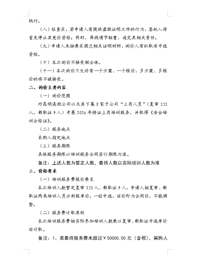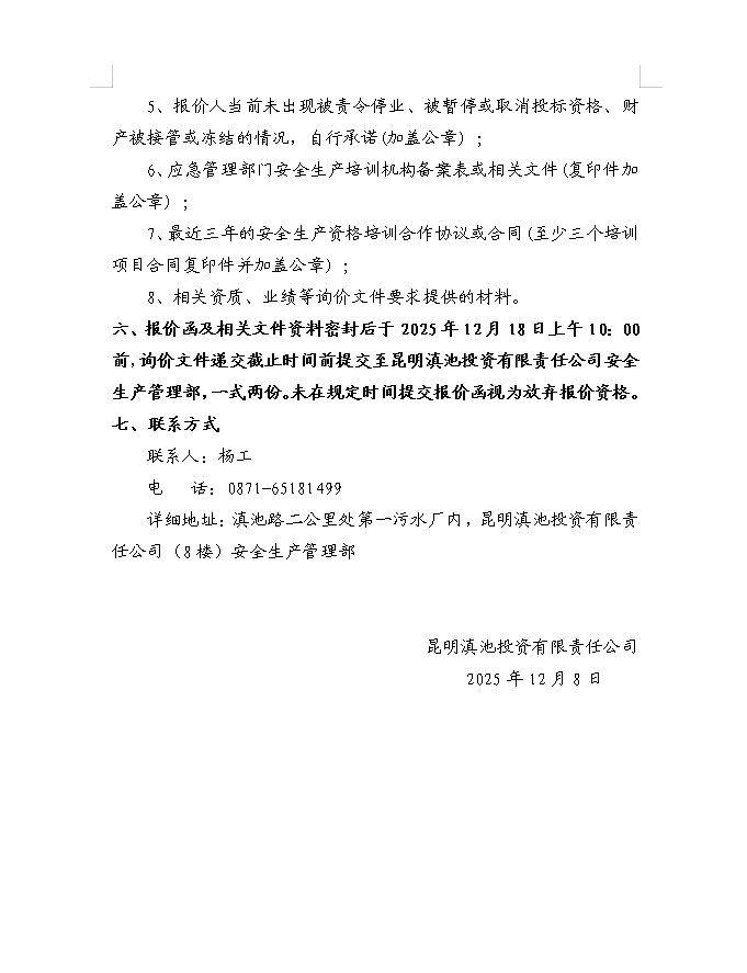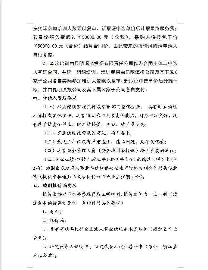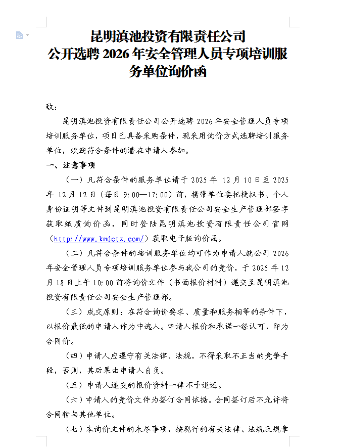 昆明滇池投资有限责任公司公开选聘 2026 年安全管理人员专项培训服务单位询价函