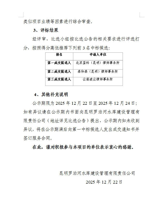 昆明罗泊河水库建设管理有限责任公司2026-2028 年法律顾问比选结果公示