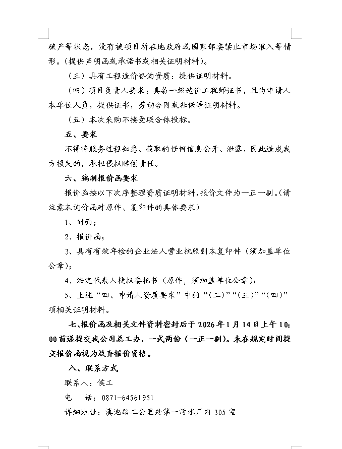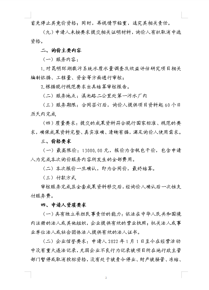 昆明滇池投资有限责任公司选聘昆明环湖截污系统水质水量调查及效益评估研究项目选聘审核单位询价函